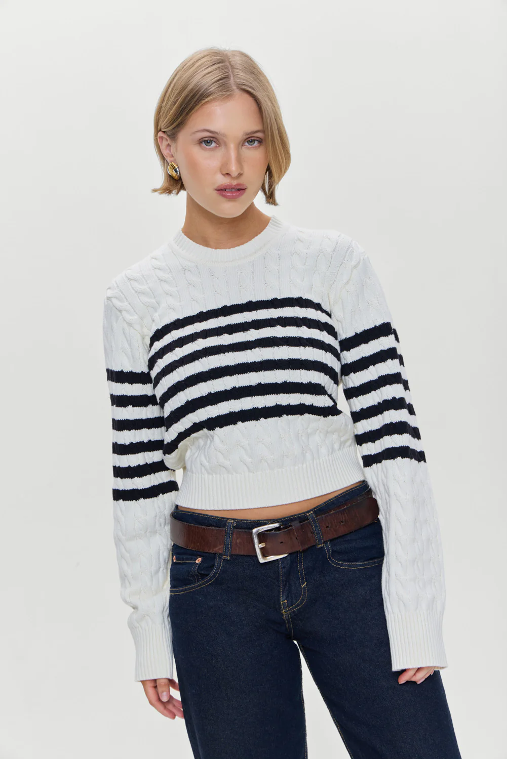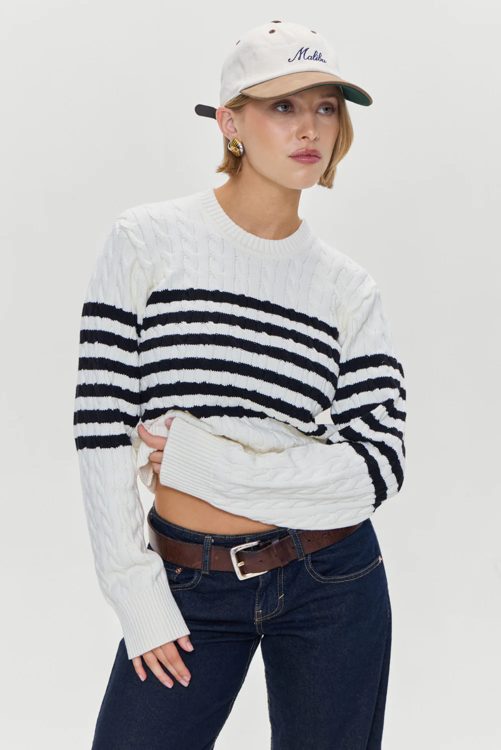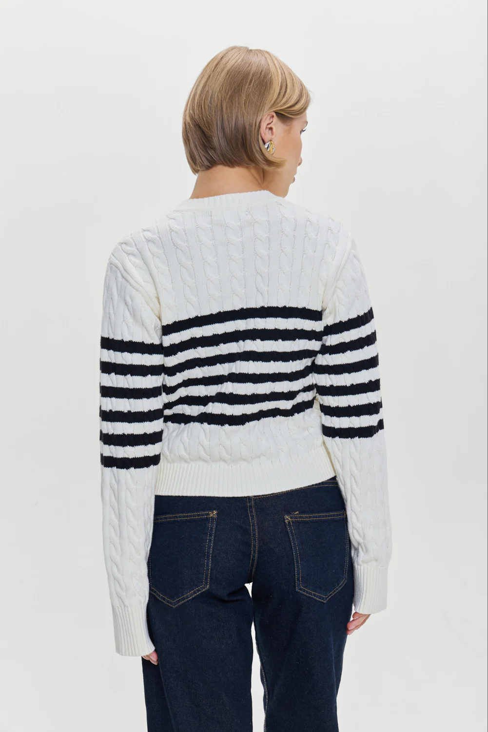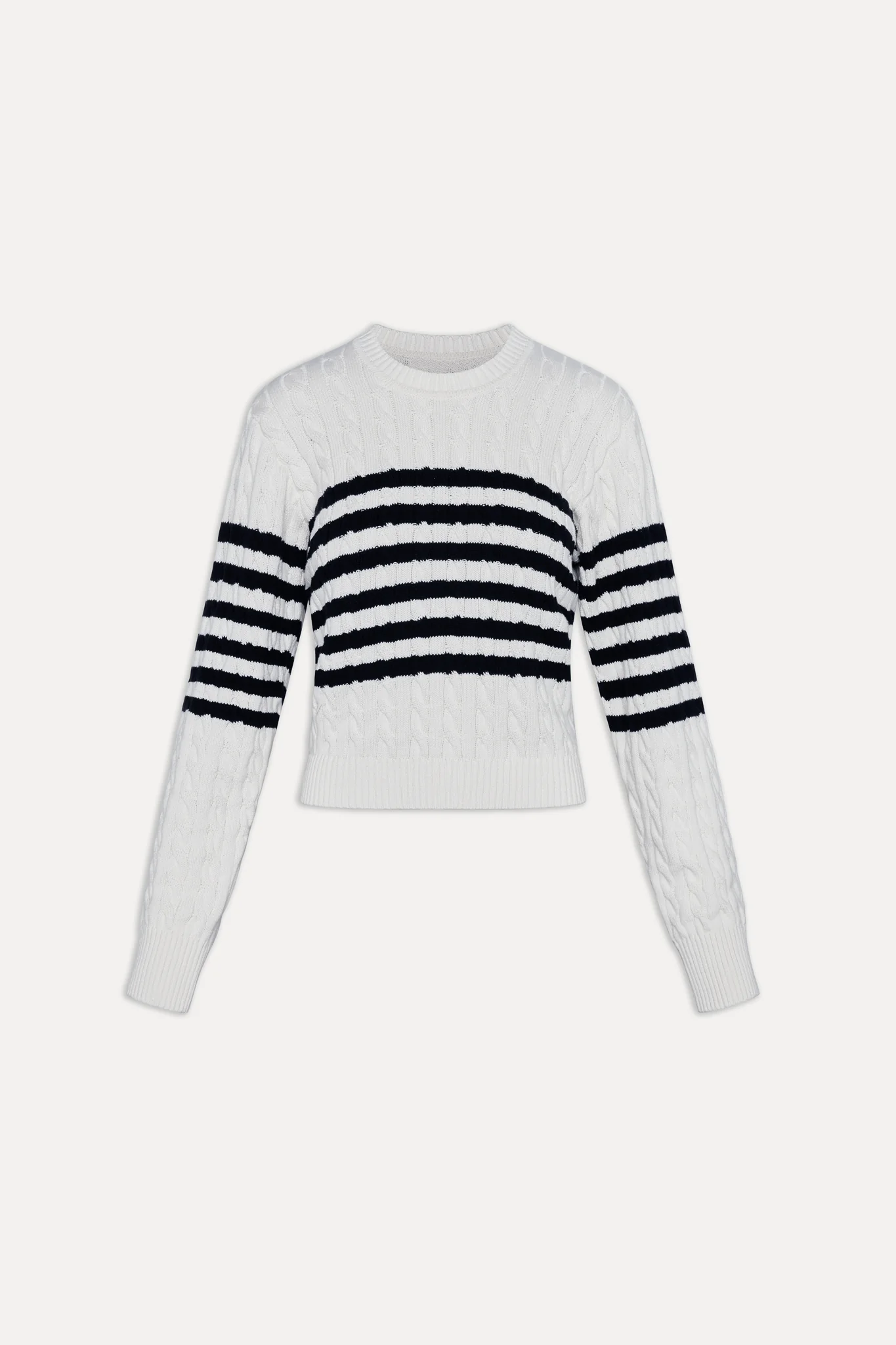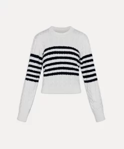 The Varsity striped sweater offers a cozy yet refined look for all your seasonal outings. Crafted from soft cotton knit fabric, this crewneck sweater is perfect for layering this winter. Details Cable knit design Snug feel with a slightly cropped fit Ribbed detailing on the neck, bottom, and cuffs Features our special