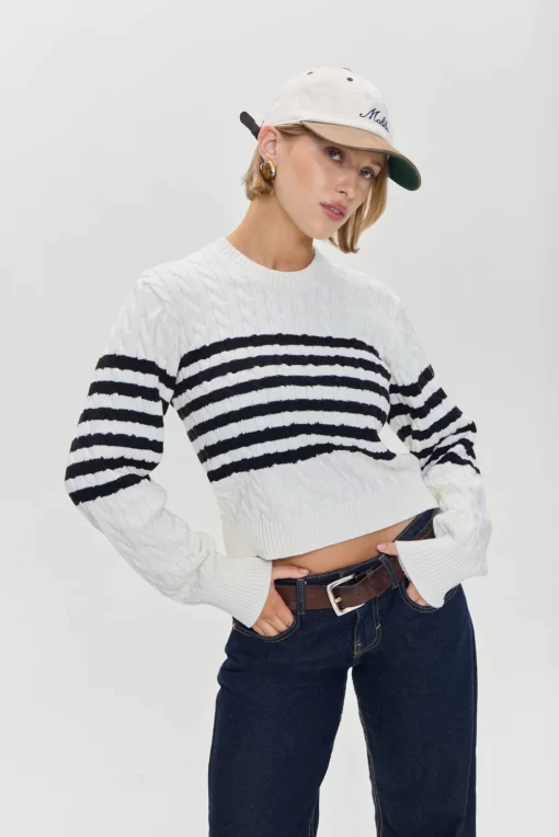 The Varsity striped sweater offers a cozy yet refined look for all your seasonal outings. Crafted from soft cotton knit fabric, this crewneck sweater is perfect for layering this winter. Details Cable knit design Snug feel with a slightly cropped fit Ribbed detailing on the neck, bottom, and cuffs Features our special